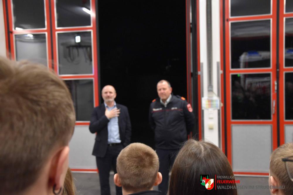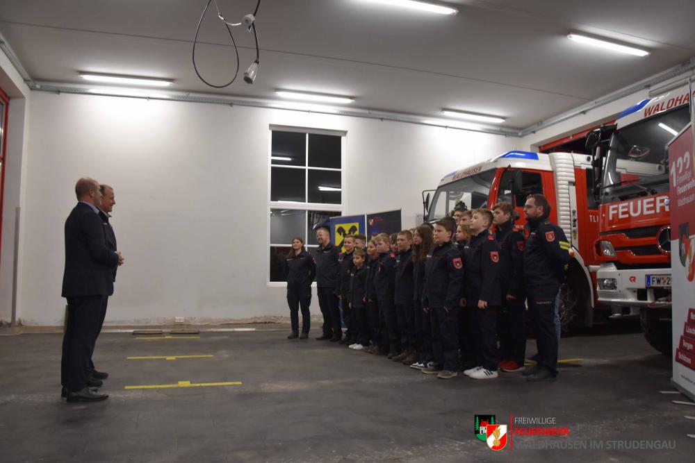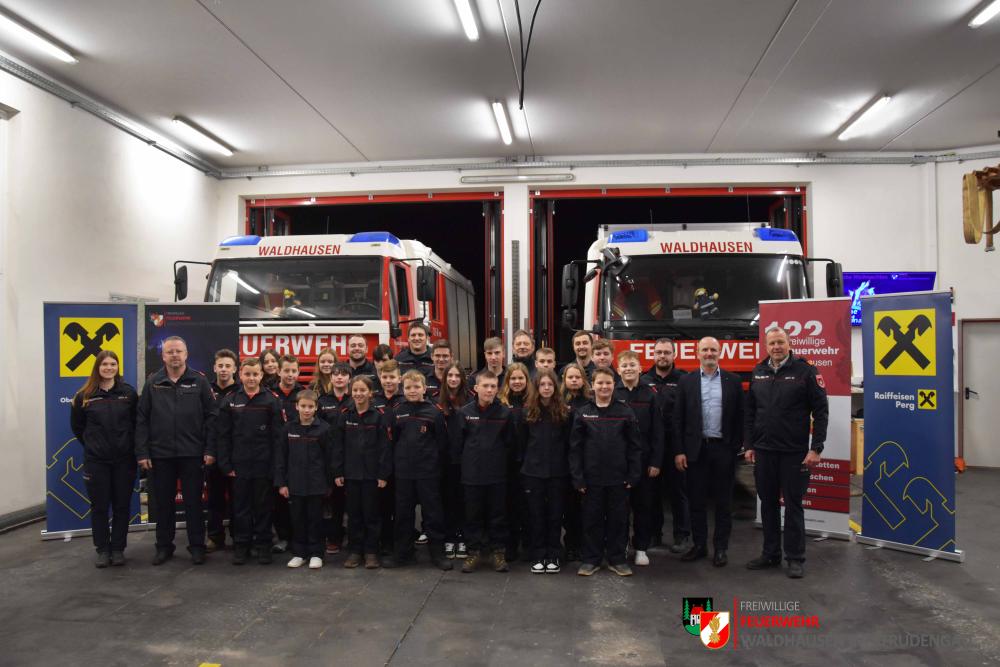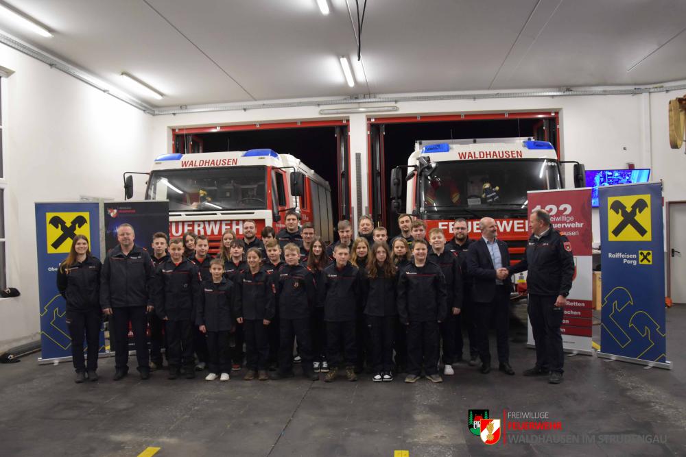 Auch unsere Jugend erstrahlt nun in neuer Pracht. Zum Ende des letzten Jahres bekamen knapp 30 Jugendmitglieder ihre neue Dienstbekleidung überreicht. Die Anschaffung von Bekleidung stellt einen großen Kostenpunkt dar. Daher sind wir überaus glücklich, dass die Raiffeisenbank mit einer sehr großzügigen Spende uns unterstützt und einen Großteil beiträgt. Alfons Puchner Leiter der Bankstelle Waldhausen betonte wie wichtig er es findet gutes zu fördern und wie schön es ist die Freude in den Augen unserer Florianijünger zu sehen. Kommandant HBI Martin Zeh bedankte sich für die jahrelange Unterstützung.