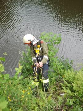 Am Mittwoch den 26.06.2013 wurde die FF-Waldhausen zu einer Tierrettung im alten Steinbruch in Gloxwald alarmiert. Ein Hund ist eine 6 Meter hohe Felswand abgestürzt und hat sich zwischen den Steinen und den Sträuchern nicht mehr aus eigner Kraft befreien können. Ein Feuerwehrmann hat sich, gesichert mit dem Höhenrettungsset an der Absturzstelle zum verunfallten Hund abgeseilt,während zwei weitere Feuerwehrmänner mit einem Boot zur Unfallstelle fuhren. Der Hund wurde von seiner misslichen Lage befreit und blieb unverletzt.
