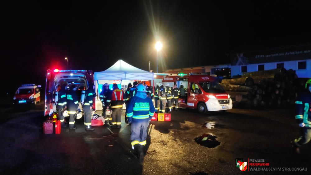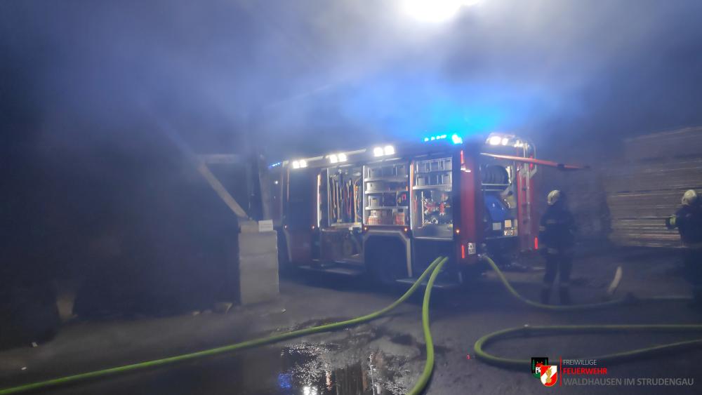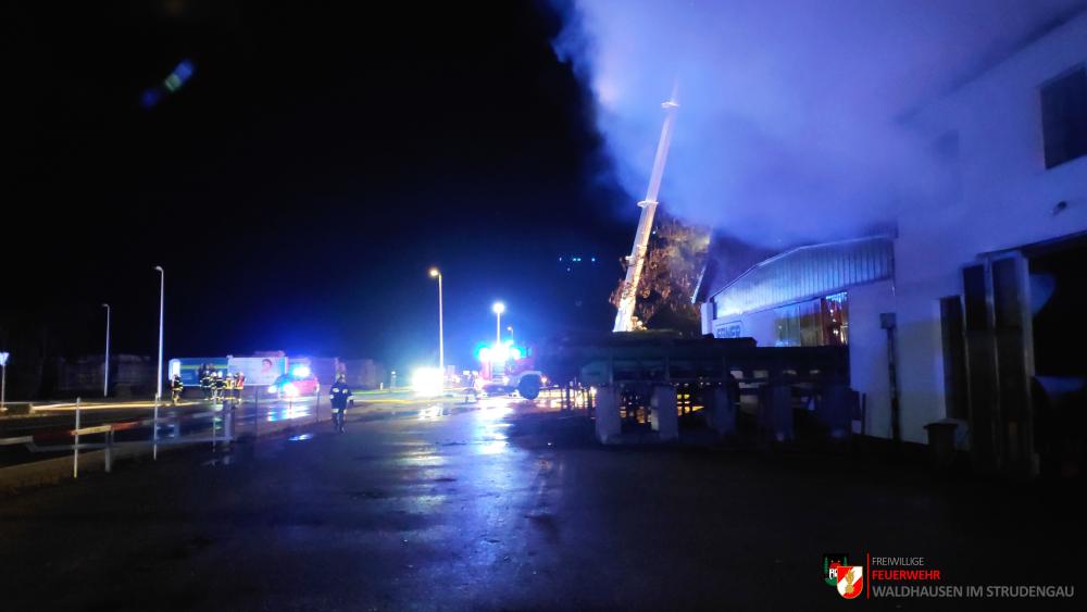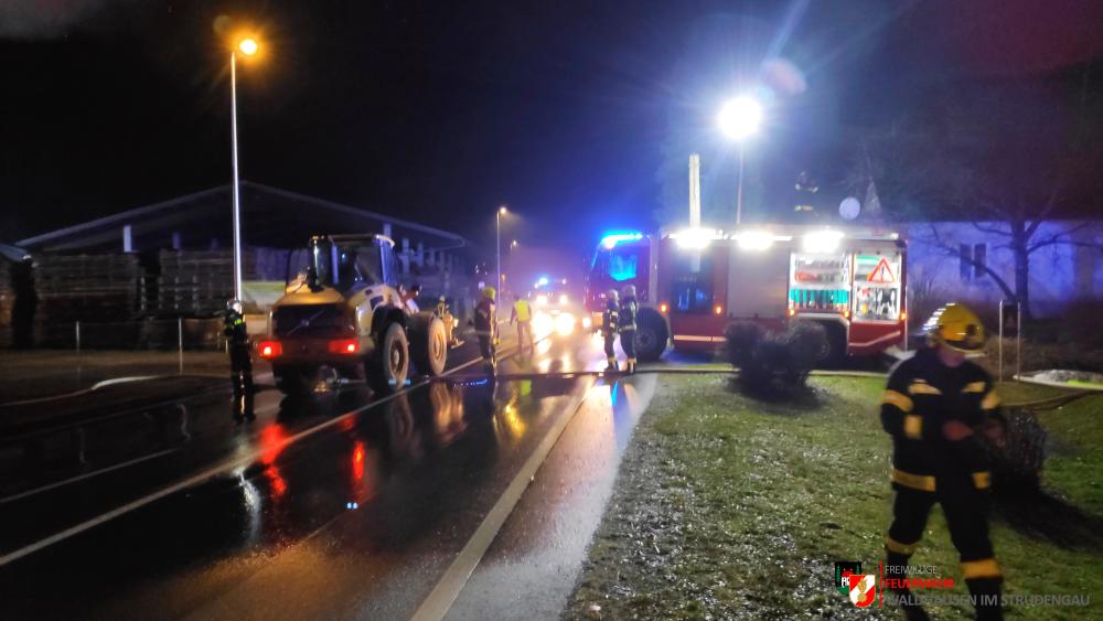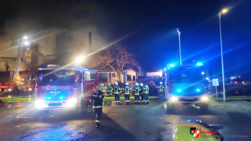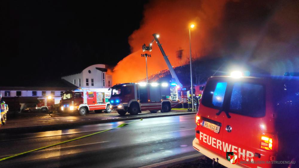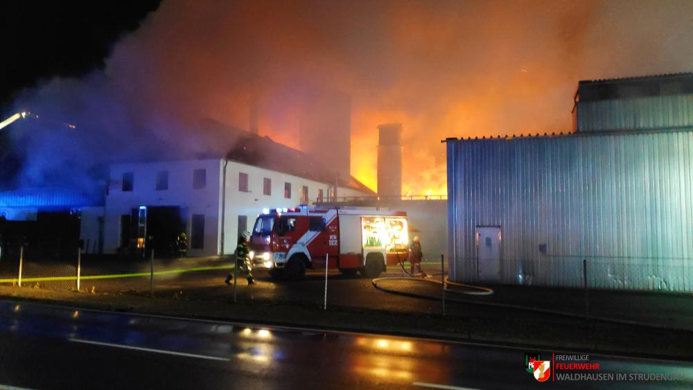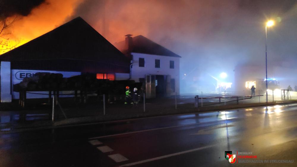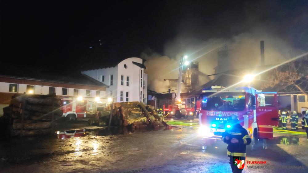 Um 23.22 Uhr wurde die freiwillige Feuerwehr Grein zu einem Brand Industrie alarmiert. Aufgrund des starken Feuerscheins welcher bereits während der Anfahrt wahrgenommen wurde, lösten diese die Alarmstufe 3 aus. Daher rückten wir mit dem LFB-A2 sowie mit dem KDOF-A zum Einsatzort aus. Die Löschwasserversorgung konnte aufgrund der naheliegenden Donau rasch sichergestellt werden. Um die maximale Menge an Wasser zu fördern, waren vorübergehend 7 Tragkraftspritzen im Einsatz. Die gesetzten Maßnahmen konnten einige Nebengebäude sowie auch den Bürotrakt erfolgreich vor den Flammen schützen. Die Bundesstraße musste für die Dauer des Einsatzes vollständig gesperrt werden. Ebenso wurde der Zugverkehr auf der Donauuferbahn eingestellt. Die erzeugten Wärmebilder einer Drohne konnten die Einsatzleitung bei der Lageerkundung enorm unterstützen. Mehrere C sowie B Rohre vom Boden aus sowie direkt von der Teleskopmastbühne konnten die Flammen eindämmen. Außerdem wurde das GTLF der Feuerwehr Amstetten angefordert um den Keller gänzlich mit Schaum zu füllen. Ein Radlader sowie später auch ein Bagger konnten Material wegschaffen, um so an die Glutnester zu kommen. 16 Feuerwehren aus Ober- und Niederösterreich mit über 220 Einsatzkräften standen im Löscheinsatz. Beim Einsatz wurden keine Personen verletzt. Der Einsatz dauerte noch bis am späten Abend an. Laut Ermittlungen der oberösttereichischen Brandermittlungsbehörde sei ein erhitzter Keilriemenantrieb vermutlich für den Großbrand verantwortlich