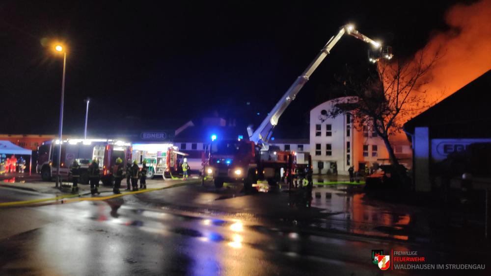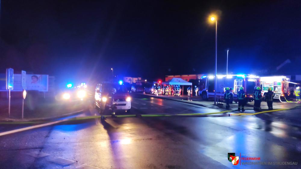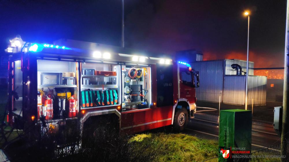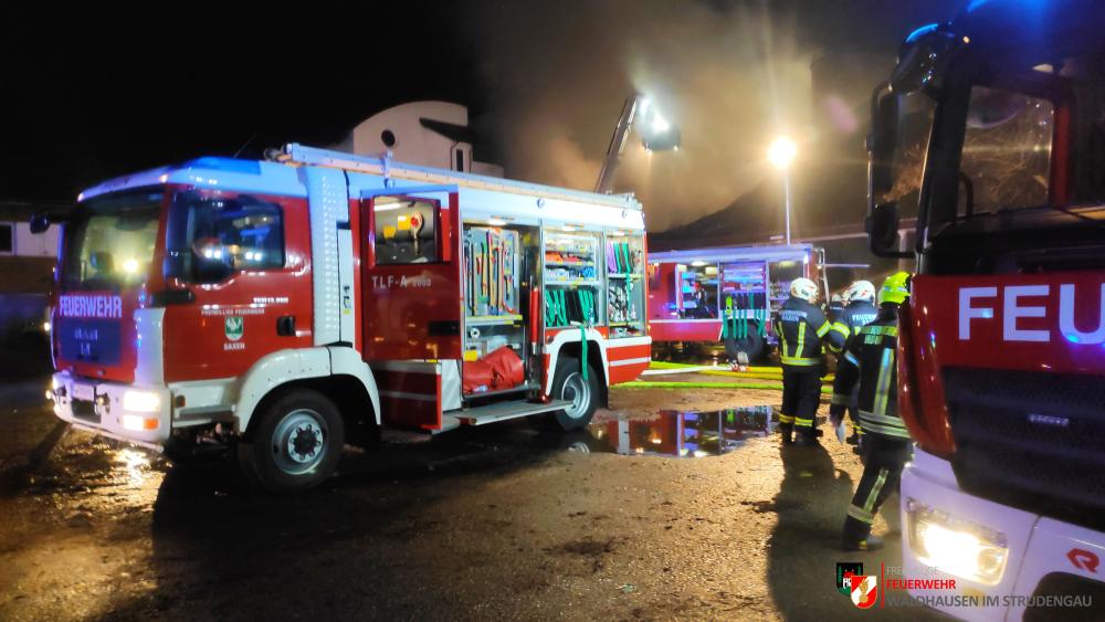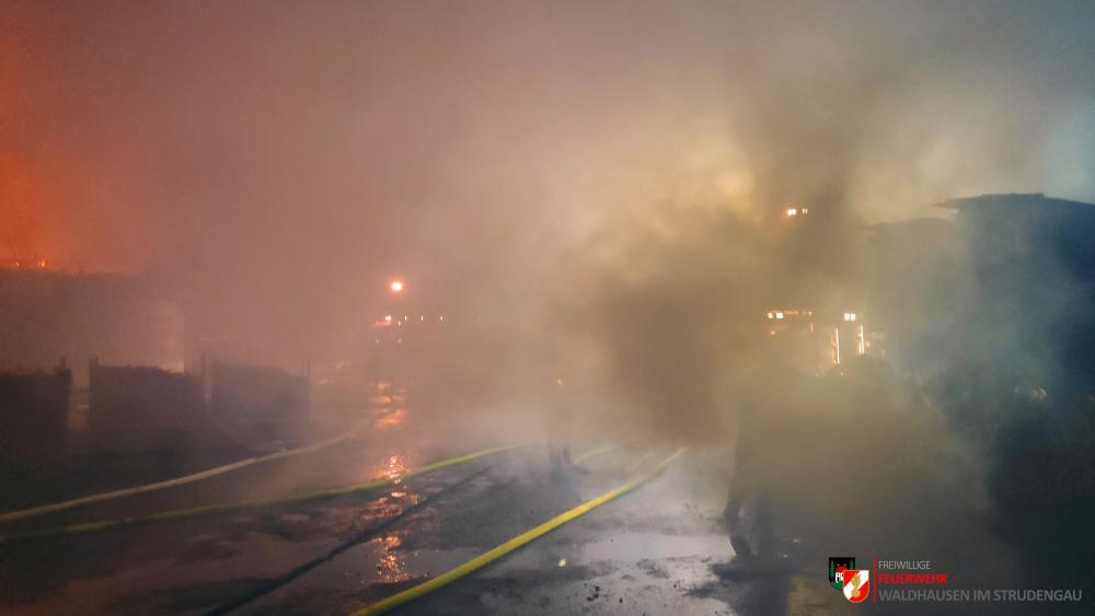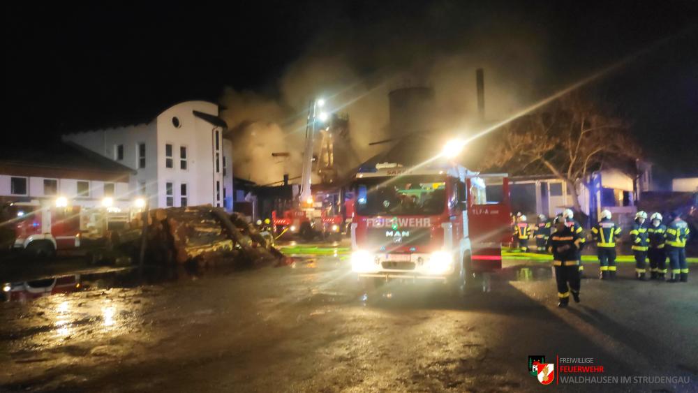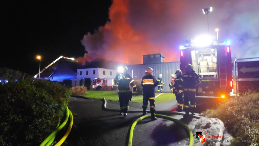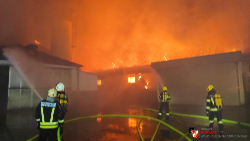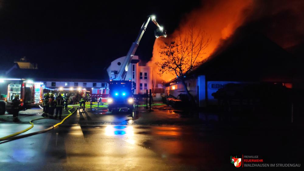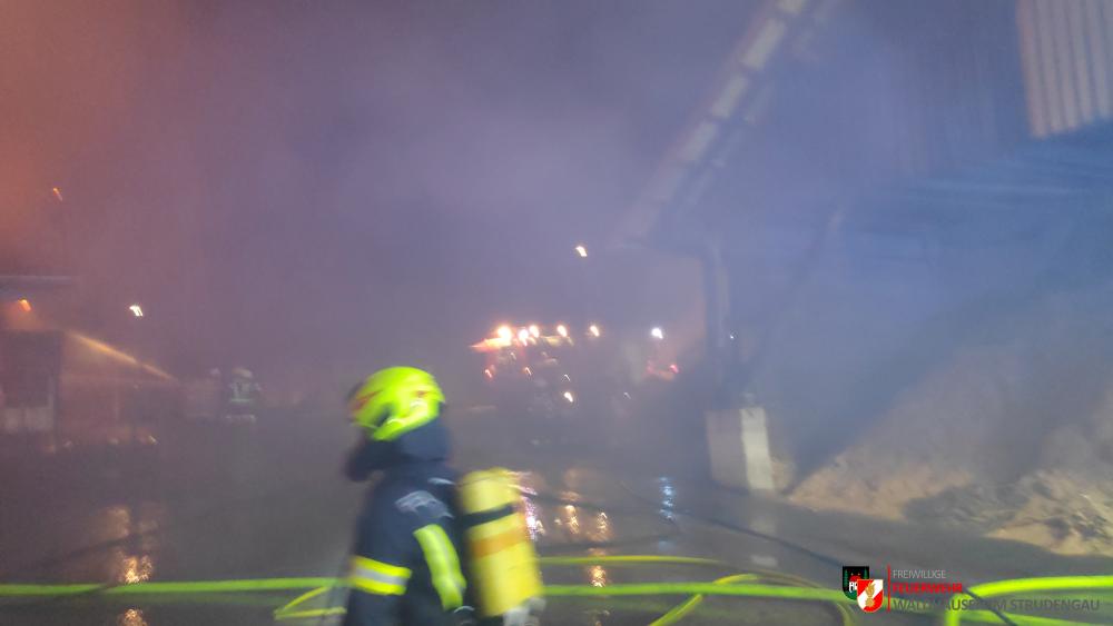 Um 23.22 Uhr wurde die freiwillige Feuerwehr Grein zu einem Brand Industrie alarmiert. Aufgrund des starken Feuerscheins welcher bereits während der Anfahrt wahrgenommen wurde, lösten diese die Alarmstufe 3 aus. Daher rückten wir mit dem LFB-A2 sowie mit dem KDOF-A zum Einsatzort aus. Die Löschwasserversorgung konnte aufgrund der naheliegenden Donau rasch sichergestellt werden. Um die maximale Menge an Wasser zu fördern, waren vorübergehend 7 Tragkraftspritzen im Einsatz. Die gesetzten Maßnahmen konnten einige Nebengebäude sowie auch den Bürotrakt erfolgreich vor den Flammen schützen. Die Bundesstraße musste für die Dauer des Einsatzes vollständig gesperrt werden. Ebenso wurde der Zugverkehr auf der Donauuferbahn eingestellt. Die erzeugten Wärmebilder einer Drohne konnten die Einsatzleitung bei der Lageerkundung enorm unterstützen. Mehrere C sowie B Rohre vom Boden aus sowie direkt von der Teleskopmastbühne konnten die Flammen eindämmen. Außerdem wurde das GTLF der Feuerwehr Amstetten angefordert um den Keller gänzlich mit Schaum zu füllen. Ein Radlader sowie später auch ein Bagger konnten Material wegschaffen, um so an die Glutnester zu kommen. 16 Feuerwehren aus Ober- und Niederösterreich mit über 220 Einsatzkräften standen im Löscheinsatz. Beim Einsatz wurden keine Personen verletzt. Der Einsatz dauerte noch bis am späten Abend an. Laut Ermittlungen der oberösttereichischen Brandermittlungsbehörde sei ein erhitzter Keilriemenantrieb vermutlich für den Großbrand verantwortlich