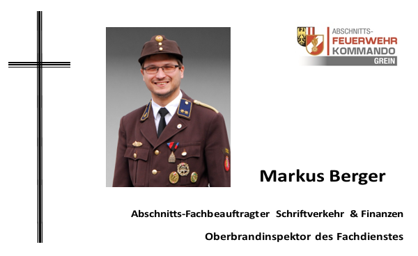 Mit tiefer Betroffenheit müssen wir leider mitteilen, dass unser ehemaliger Schriftführer und Kamerad OBI d. F. Markus Berger plötzlich und völlig unerwartet von uns gegangen ist. Offizieller Bericht Information-AB-Grein Trauerparte Trauertparte-Markus-Berger.pdf